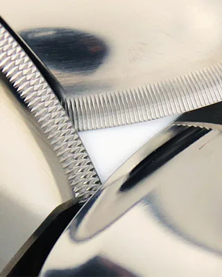 - Kreuzrändel: Die kreuzförmige Struktur teilt den Lackfilm besonders definiert auf. Dadurch entstehen gleichmäßig ausgebildete Tropfen. Diese Ausführung wird häufig für hochwertige Finish-Anwendungen eingesetzt, insbesondere im Klarlackbereich. Sie kann zudem dazu beitragen, Lufteinschlüsse beziehungsweise Mikrobläschen im Lack zu reduzieren und ein homogeneres Oberflächenbild zu erzielen.